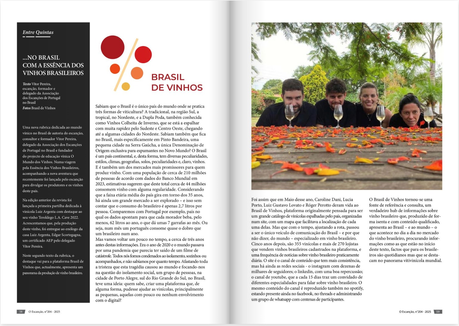 Uma iniciativa criada por quatro amigos que ‘aproveitaram’ a pandemia para listar e divulgar as vinícolas, os produtores e os vinhos brasileiros, ganha espaço nobre na revista O Escanção, a mais antiga revista portuguesa de vinhos, editada em Portugal desde 1974 pela Associação dos Escanções de Portugal (AEP). Sim, o Brasil de Vinhos é destaque na edição 204, em matéria de página dupla com direito a foto colorida dos sócios Róger Perotto, Luiz Gustavo Lovato, Caroline Dani e Lucia Porto.