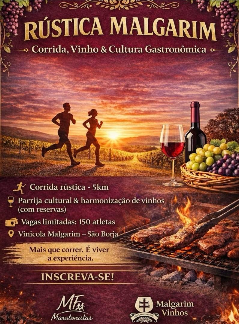 Corrida, Vinho & Cultura Gastronômica, na Vinícola Malgarim. Corrida rústica de 5 km entre vinhedos, kit atleta completo, premiação geral e por categoria, complementada com experiência gastronômica.