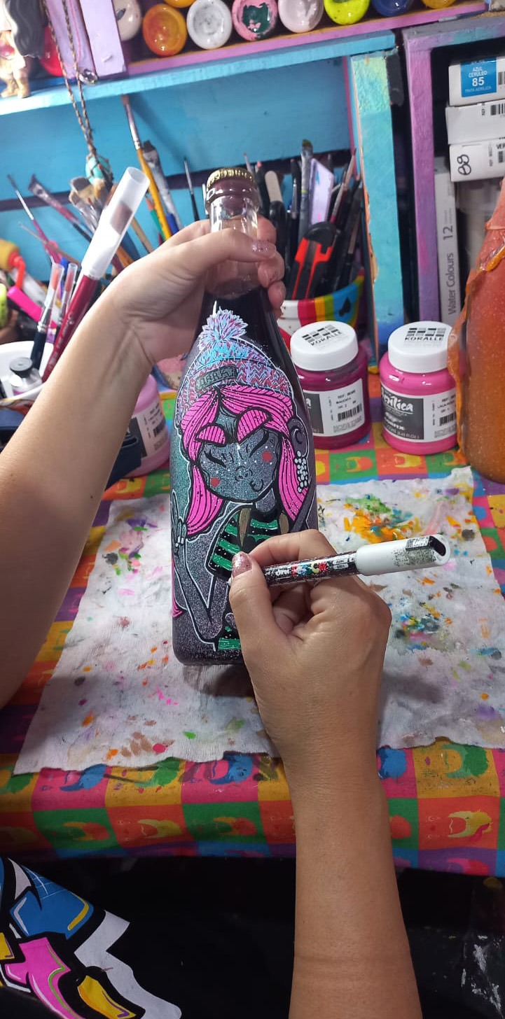 “Doar as garrafas foi uma das formas que encontramos de ajudar essas pessoas que perderam suas casas, seus ateliês, seus trabalhos e acervos”, diz Caio. Em comum, os espumantes doados pela cantina Mincarone têm o método, chamado de ‘pét-nat’, que em francês significa borbulhante natural. É o espumante feito no método ancestral, anterior ao clássico, e consiste apenas em uma fermentação que termina na garrafa. Ao contrário dos métodos mais conhecidos, no pét-nat não há adição de leveduras ou açúcar. “A Naturebas ofereceu um espaço exclusivo para o movimento #SocialSul realizara venda, e clientes e amigos também contribuíram para que conseguíssemos doar kits com canetas para esses onze artistas”, resume o vinhateiro. Na foto acima, Ana Scarceli com um uma de suas criações.