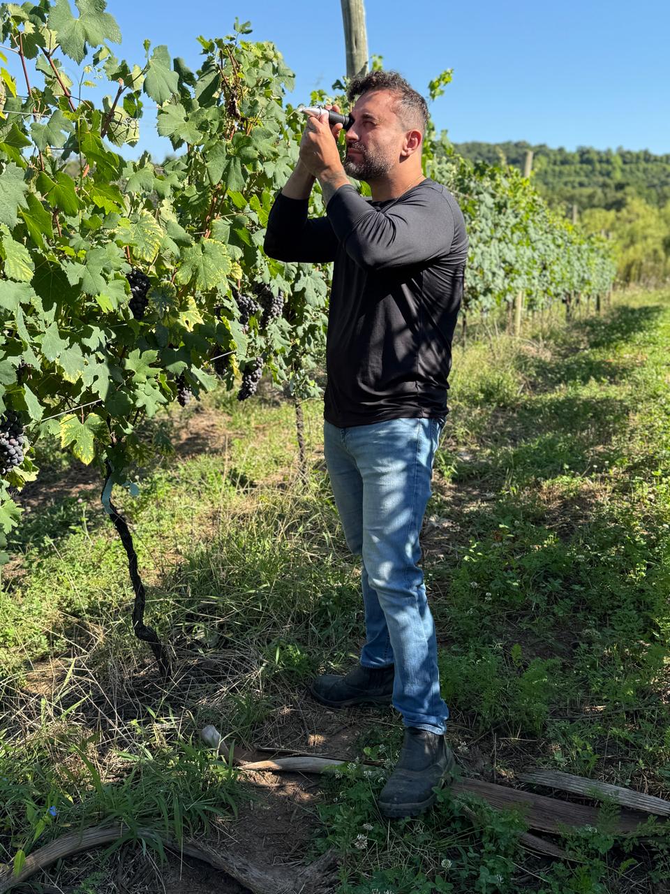 Além da Marzemino, Felipe cultiva as tintas Nebbiolo, Merlot, Cabernet Franc, Tannat, Teroldego, Syrah, Pinot Noir e Malbec. Entre as brancas, Sauvignon Blanc, Semillon, Chardonnay e a Alvarinho, casta que é objeto de um experimento realizado em parceria com o produtor James Carl, da vinícola Negroponte, também de Monte Belo do Sul: “estamos fazendo a seleção massal da Alvarinho, buscando as melhores plantas para a produção de vinhos e espumantes para re-enxertia na época mais adequada”, explica James (foto acima).