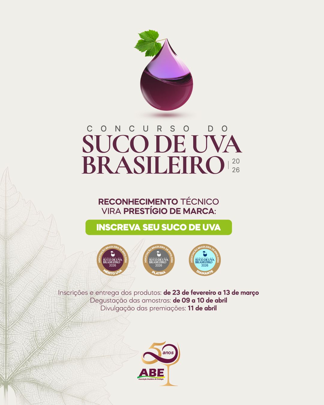 O 1º concurso de suco de uva brasileiro será realizado entre os dias 9 e 11 de abril, em Bento Gonçalves (RS). As inscrições das amostras – feitas por empresas e produtores com produtos registrados no MAPA, em conformidade com a legislação brasileira – podem ser feitas na ABE entre os dias 23 de fevereiro e 13 de março. A premiação será entregue no dia 11 de abril.